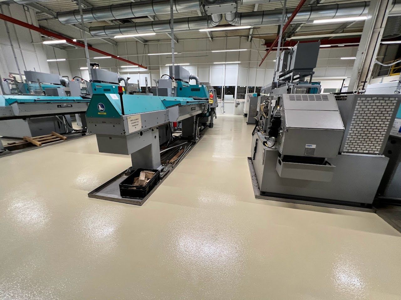 Pour les ateliers d'usinage, où des machines comme les tours et fraiseuses sont utilisées, les sols doivent résister aux huiles et aux copeaux métalliques.